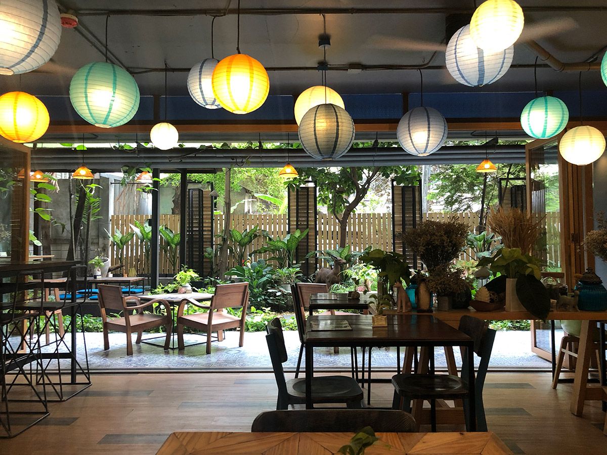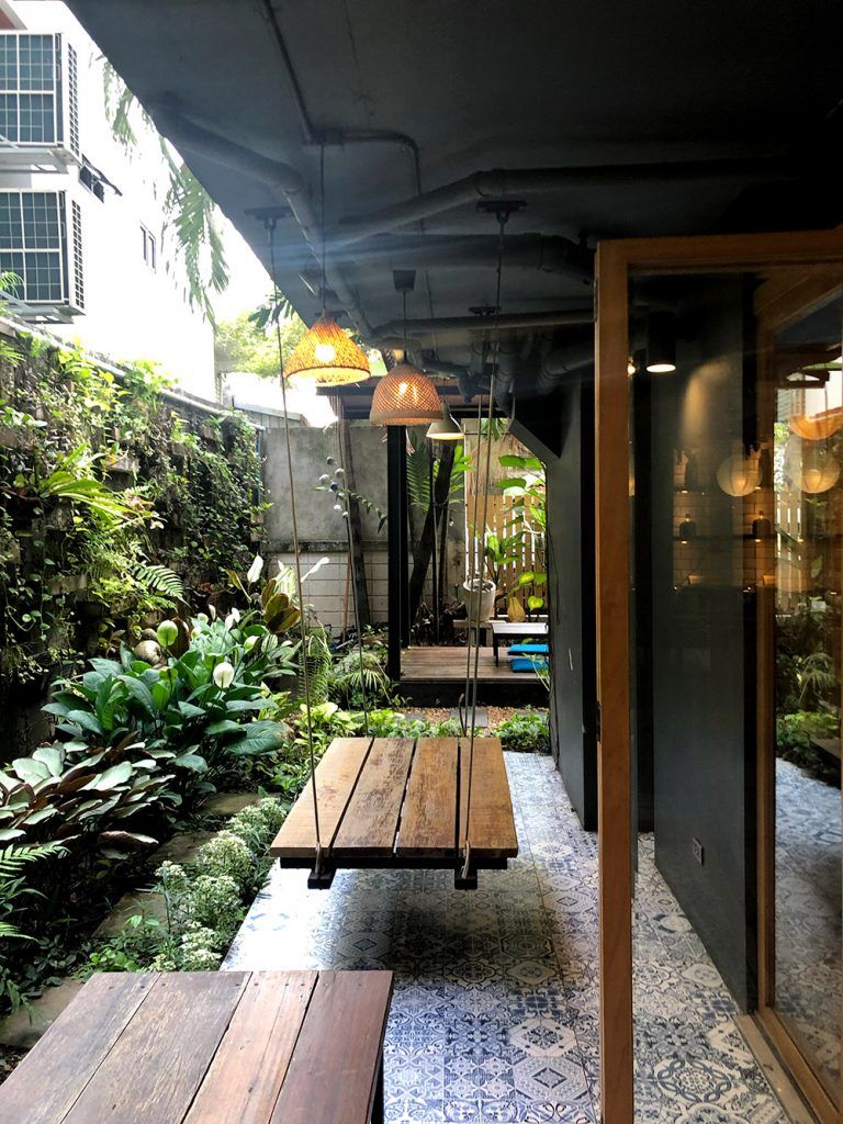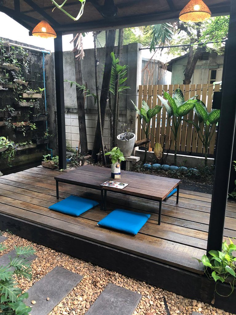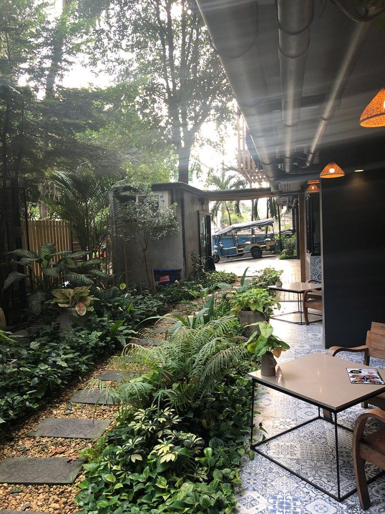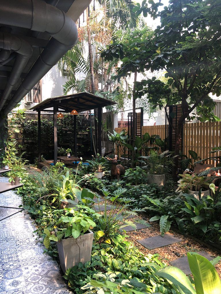 1階には中庭があり、朝食やランチ、カフェとして利用したり、のんびり読書することもできます。猫がくつろいでいるのをよく見かけました。