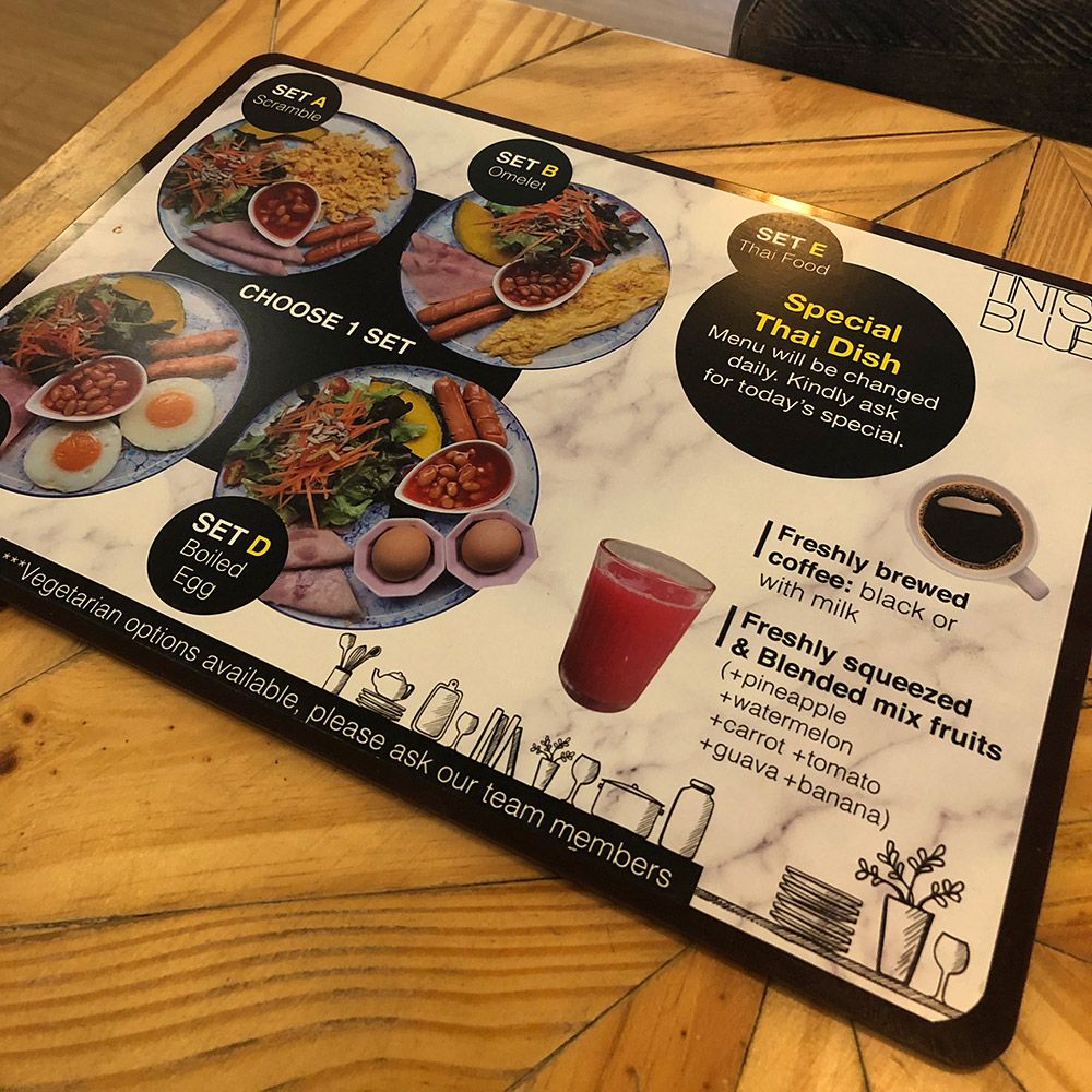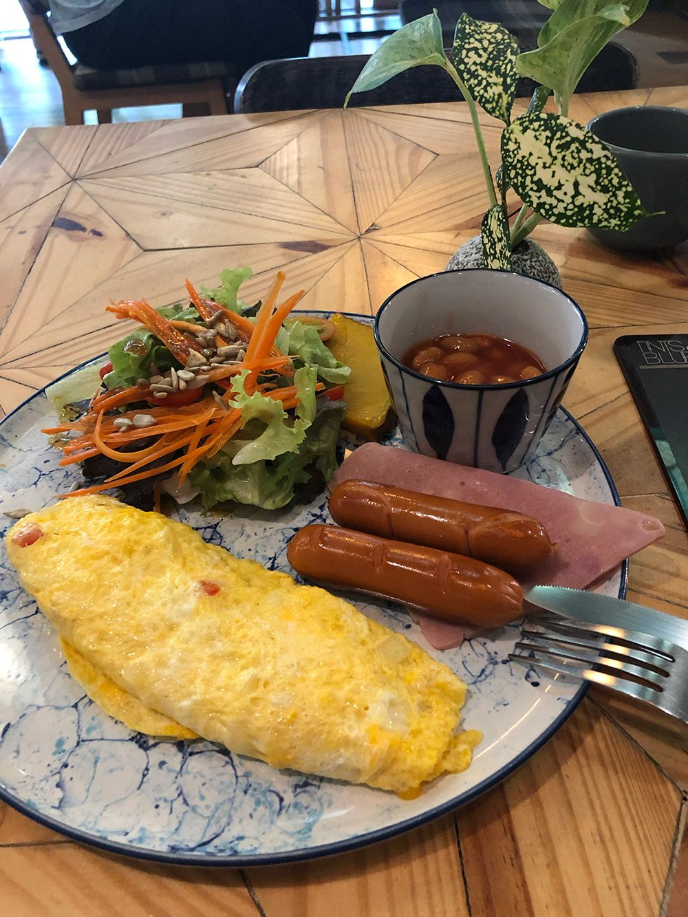 朝食のメニューは以下の「スクランブルエッグ」「オムレツ」「目玉焼き」「ゆで卵」「日替わりのタイ料理」があり、ミックスジュースとコーヒーが付きます。ベジタリアン向けのオプションもあるようです。