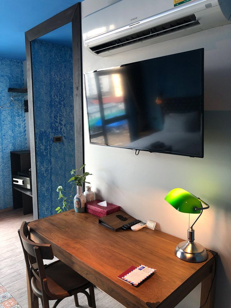 作業をするのに最適な大きめのデスクもあります。おしゃれなデスクライト付き。Wi-Fiも快適です。