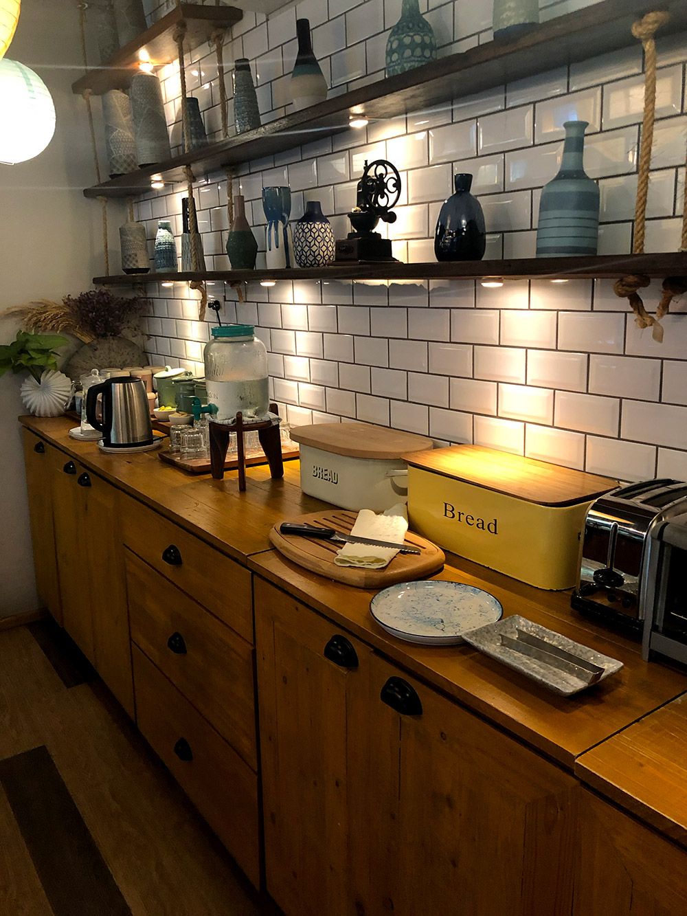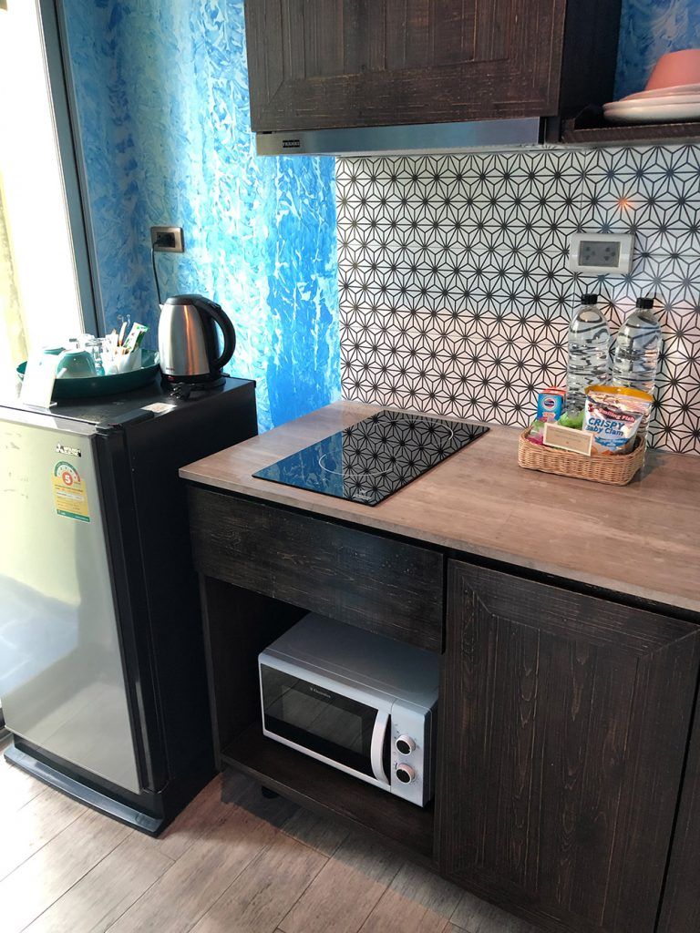 キッチンも電子レンジも完備されており、食材を買ってきて自分で料理もできます。お水やコーヒー、スナックは無料です。