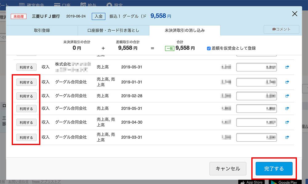 そこで、今回の入金はいつの売上に対する入金なのかを選びます。以下の画面のように、以前月ごとに手動で売上を入力したもの(グーグルになっているもの)があると思いますので、グーグルになっている売上をすべて「利用する」ボタンを押していきます。
