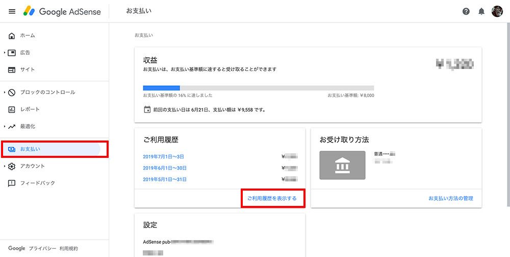 まず、Googleアドセンスの「お支払い」画面にある、画面真ん中の「ご利用履歴を表示する」をクリックし、売り上げの履歴を確認します。