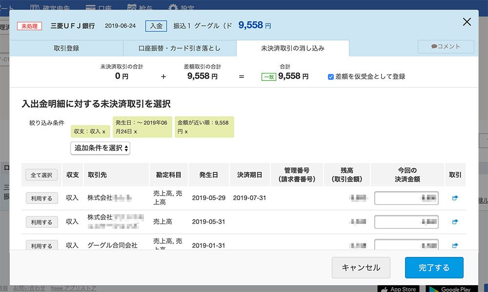 すると、以下の赤枠左の「未決済取引の合計」が、実際振り込まれた金額と一致しますので、右下の「完了する」を押します。