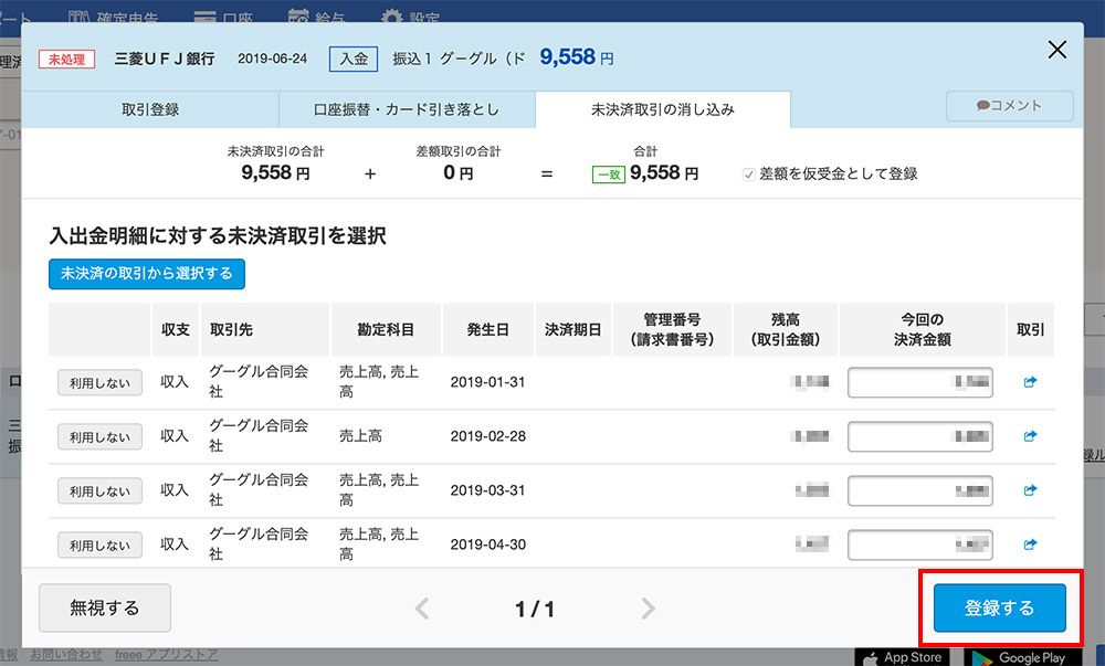 ここで、そのまま登録してはいけません。今まで月ごとに入力してきた売上がまだ未入金になっていますので、その取引が入金がされたよ、ということを設定します。(「未決済取引の消し込み」と言います)