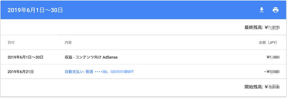 Googleアドセンスの収益は、「お支払い基準額: ¥8,000」に達していて、銀行口座の確認が終わっているアカウントに対して初めて支払われます。 つまり、毎月の収益は発生しているが、徐々に収益が溜まっていって、¥8,000を超えたら初めて銀行口座に入金される、ということになります。 しかし、確定申告のための帳簿には、たとえまだ入金されていなくても、売上があった年にその売上を申告しなければなりません。掛け売りなどのように、まだ実際に代金を受け取っていない売上げでも本年中に売り上げたものは、全て本年分の収入金額になります。平成30年分 青色申告の決算の手引き(一般用) 普通に請求書を発行する場合は、入金が先であっても売上が発生した段階で発行すると思いますが、それと同じです。 ただGoogleアドセンスの場合、特に収益化を始めたばかりの場合は、「お支払い基準額: ¥8,000」に達するまでにしばらく時間がかかるため、この売上発生の登録を忘れがちですので、気をつける必要があります。 まずは、今までの売上の履歴を確認します。