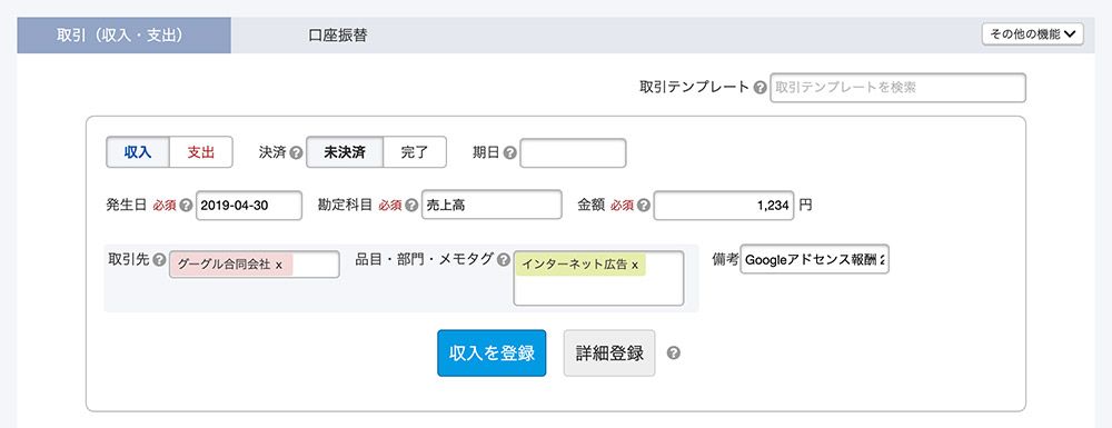 | 備考 | 入れなくても良いですが、わかりやすいように「Googleアドセンス報酬 2019年4月分」などと入れる |