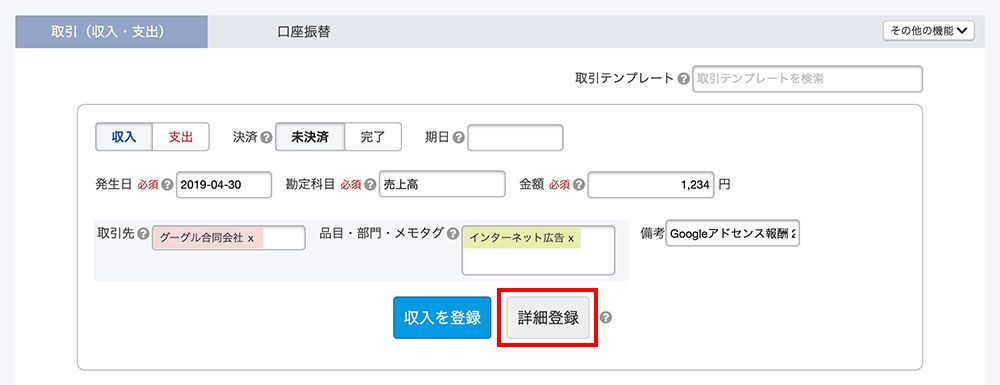 ※「収入を登録」を押して登録してしまった場合は、登録したものを編集することで同様のことが行えます。