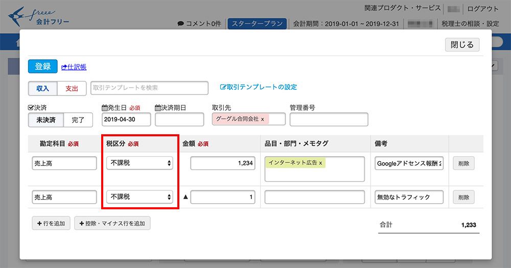 | 品目・部門・メモタグ | 入れなくても良いですが、わかりやすいように「インターネット広告」を選択 |