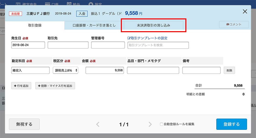 取引登録ではなく、「未決済取引の消し込み」をするため、右上あたりにある「未決済取引の消し込み」のタブをクリックします。