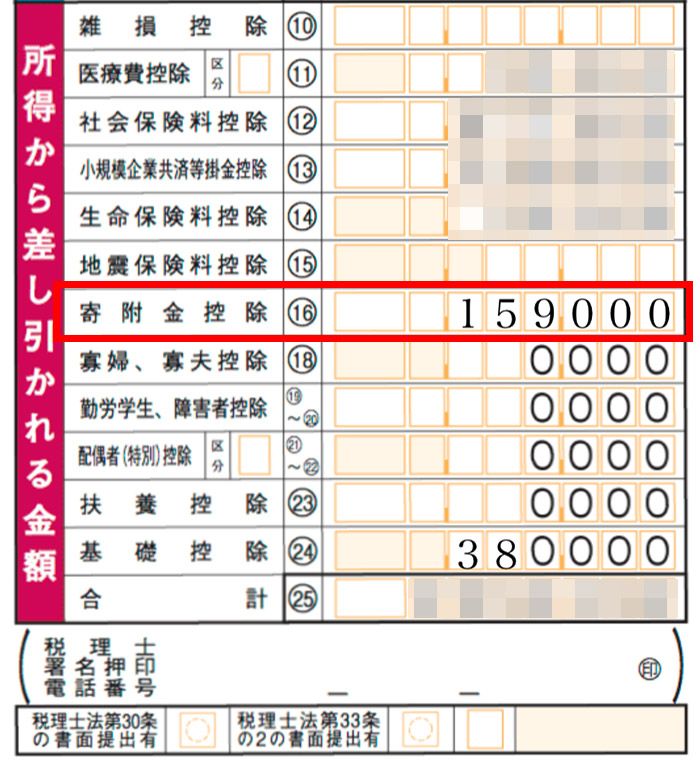 こちらに記載をして、第2表にも「寄付先の所在地・名称」を記載する場所があり、寄付金証明書を添付もしなければなりません。