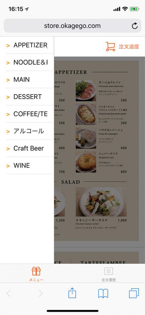 料理やドリンクを注文したい場合は、こちらも受付時にもらったQRコードでアクセスすると、メニューが表示されてそのままセルフオーダーで注文ができるようになっています。