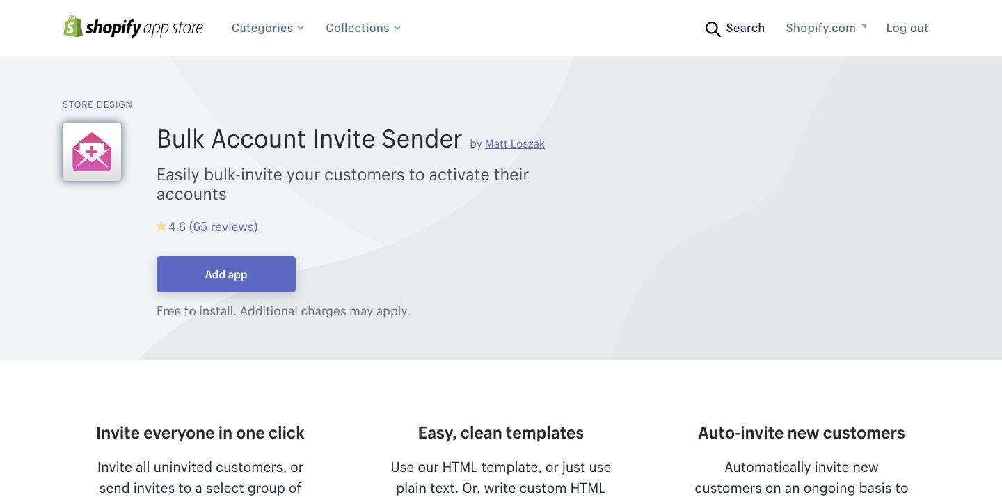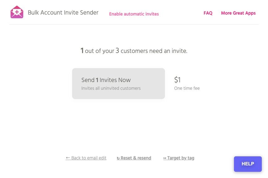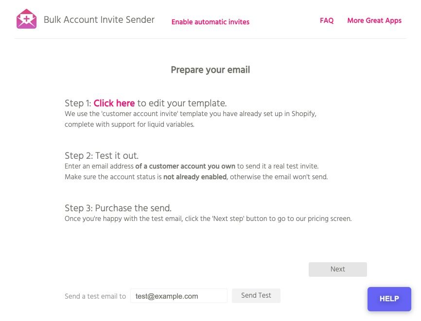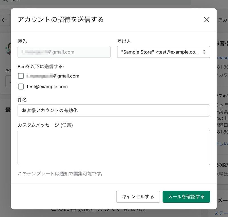 Price ranges: $1 (20 emails), to $50 (10,000 emails), etc.と、20通1ドル、1万通で50ドル、となっています。 FAQはこちら。 Bulk Account Inviter 送信されるメールは、先ほどの「会員登録ページでパスワードを登録してもらう方法」の時に送られるメールと同じです。 ※このメールは「設定」→「通知」→「お客様アカウントの有効化」で編集できます。新規会員登録時と同じメールなので注意。 アプリ管理から進むと、以下の画面が表示されるため、必要に応じてテンプレートや差出人アドレスを設定してから、次へ進みます。