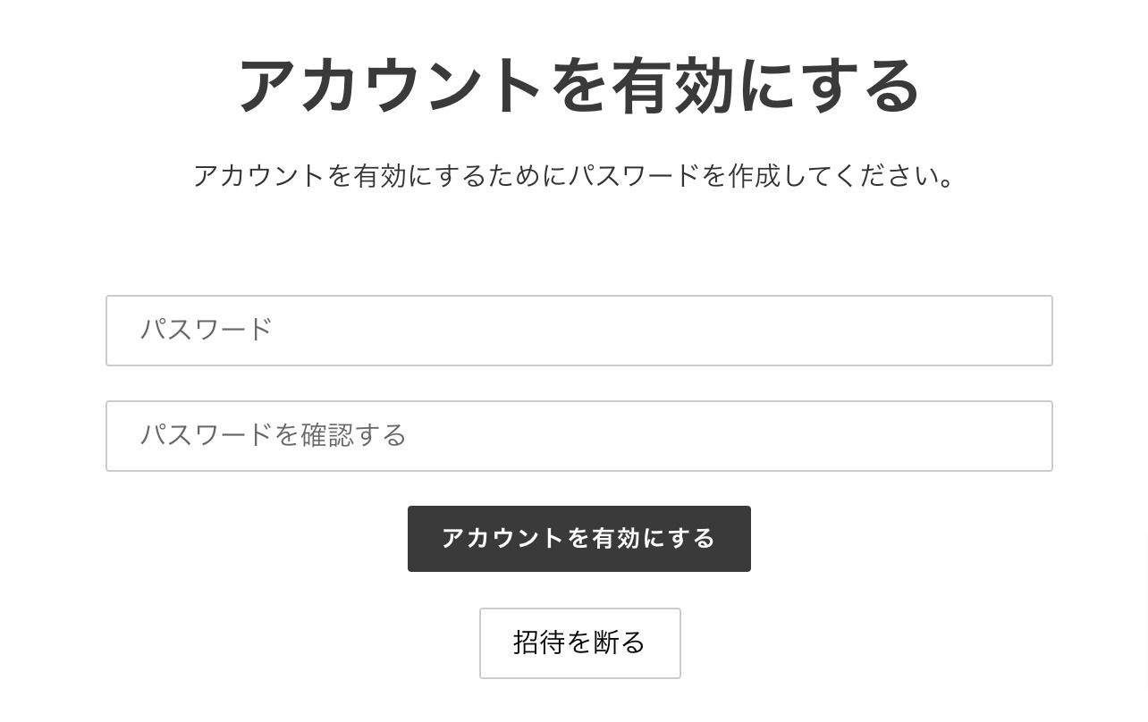 ユーザーは、届いたメールから「アカウントを有効にする」ボタンを押すと、以下の画面が表示されるので、こちらで新しいパスワードを登録すれば、アカウントの有効化が完了します。