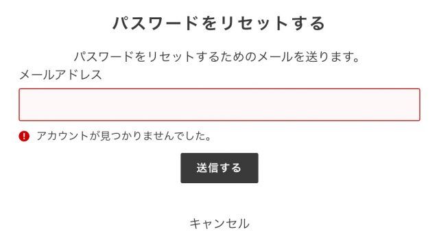 ではどのように設定してもらうかですが、ログインページにある「パスワードをお忘れですか?」を押した先のパスワードリセットページかと一瞬思いますが、ここからだと再設定できません。 試しに先ほど「アカウントはありません」で登録されていたメールアドレスを入れてみると、以下のように「アカウントが見つかりませんでした」となります。
