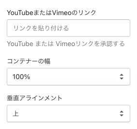 「ビデオ」を追加すると、以下のような項目が編集できます。ビデオはYouTubeとVimeoのみ挿入できます。