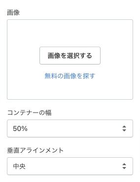 以下のように、テキストと同様に1つの幅を指定したり、中央寄せ・右寄せ左寄せ、縦方向の位置も指定できます。コンテナーの幅は25%まで選択できるので、横4列まで表示可能です。画像と先ほどのテキストを並べることも可能です。