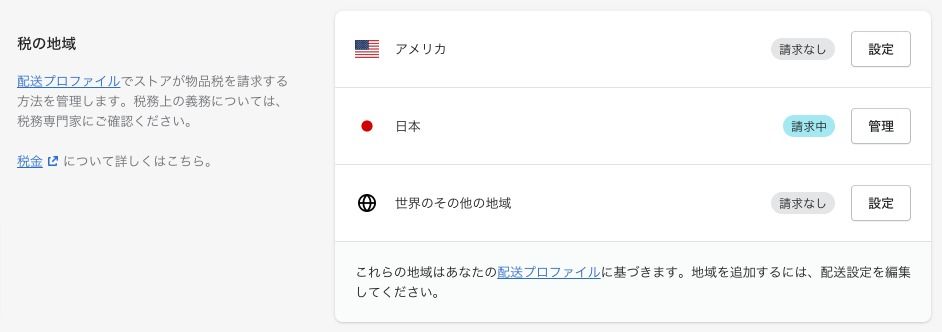 ※今回は日本のみ請求する例としていますが、各国ごとに税を細かく設定する場合はこの画面の「設定」ボタンから設定できます。