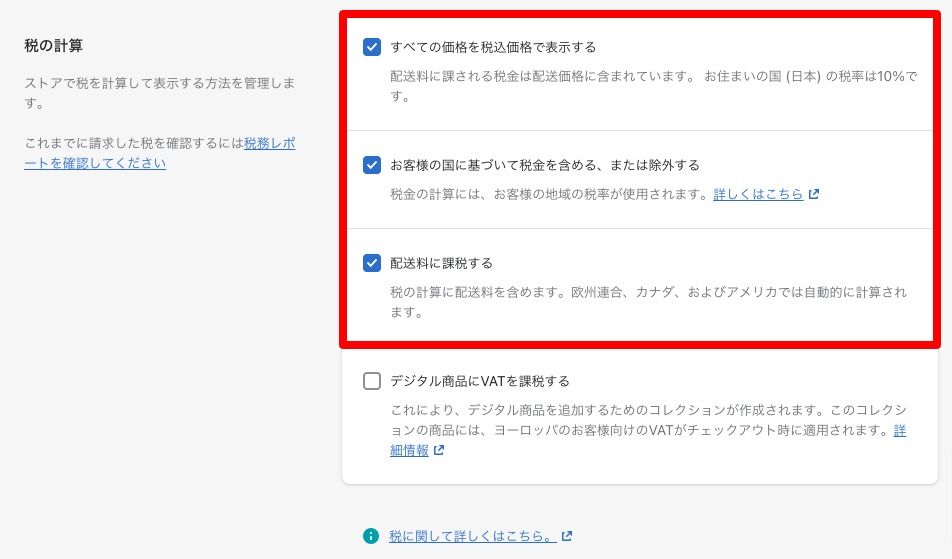 次に、国によってそれぞれ税金を設定できるようにするためには、こちらにチェックを入れます。 これにより今回の例では、日本のみ税金を請求する設定をし、他の国は(特に何もしなければ)請求なしの設定になります。