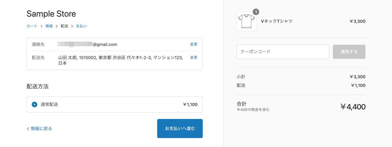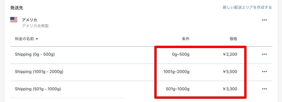 まず先ほど設定した以下の商品を購入する場合に、国内に発送する場合は以下のようになります。 商品:本体価格:3,000円/消費税:300円/税込金額:3,300円 送料:合計5,000円未満の場合、送料:1,000円/消費税:100円/税込金額:1,100円