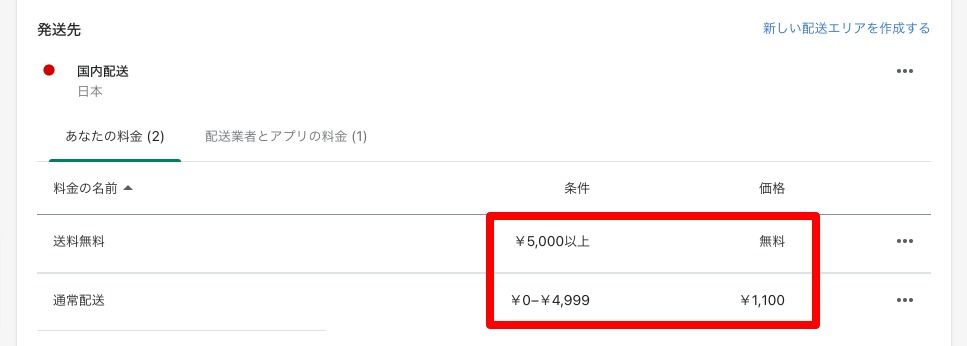 こちらにチェックを入れると、配送料に税金を含むようになります。 注意点としては、配送料の設定画面でも「税込金額」で設定します。 例として今回は以下のように設定します。 (合計5,000円未満の場合、送料:1,000円/消費税:100円/税込金額:1,100円)