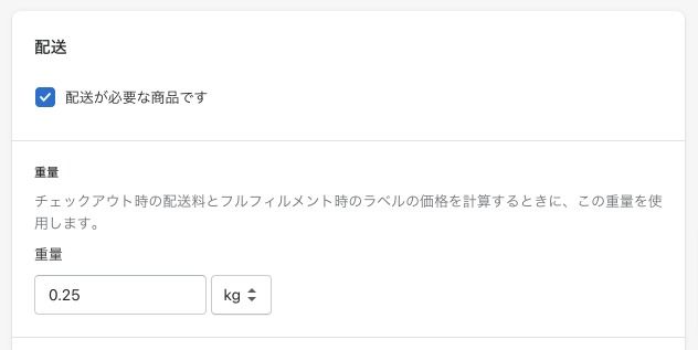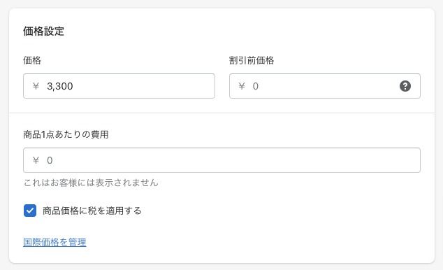 No.6902 「総額表示」の義務付け|国税庁 こちらの通り、日本では2021年4月1日より総額表示が義務付けられているため、価格は税込みで表示する必要があります。 よって、こちらにチェックを入れて、各商品の登録画面では、税込の金額を入力し、「商品価格に税を適用する」にチェックする必要があります。 今回は例として以下の商品を購入するとします。 (本体価格:3,000円/消費税:300円/税込金額:3,300円/重量:250g)