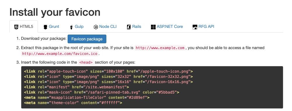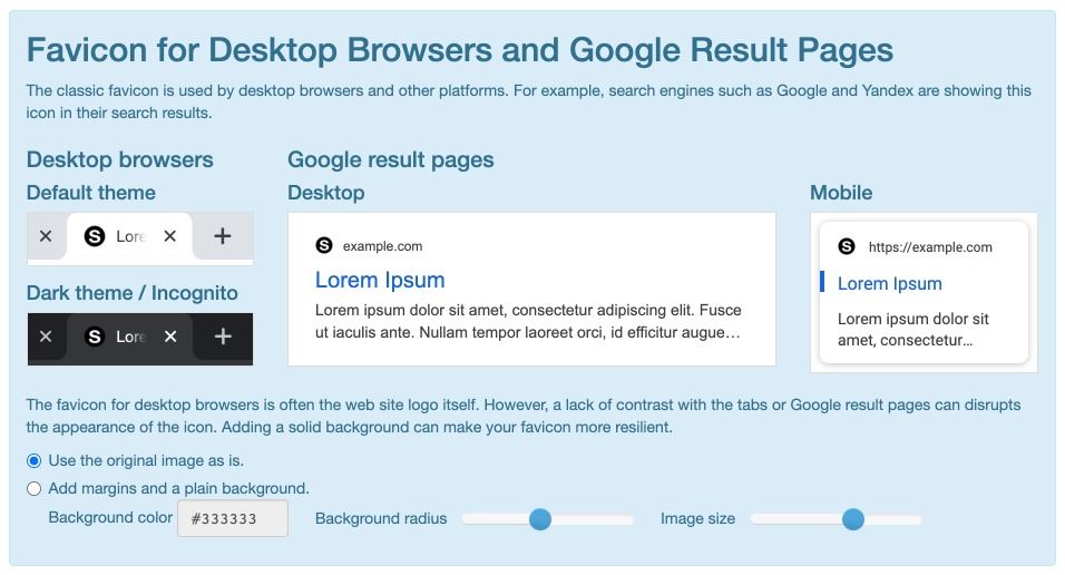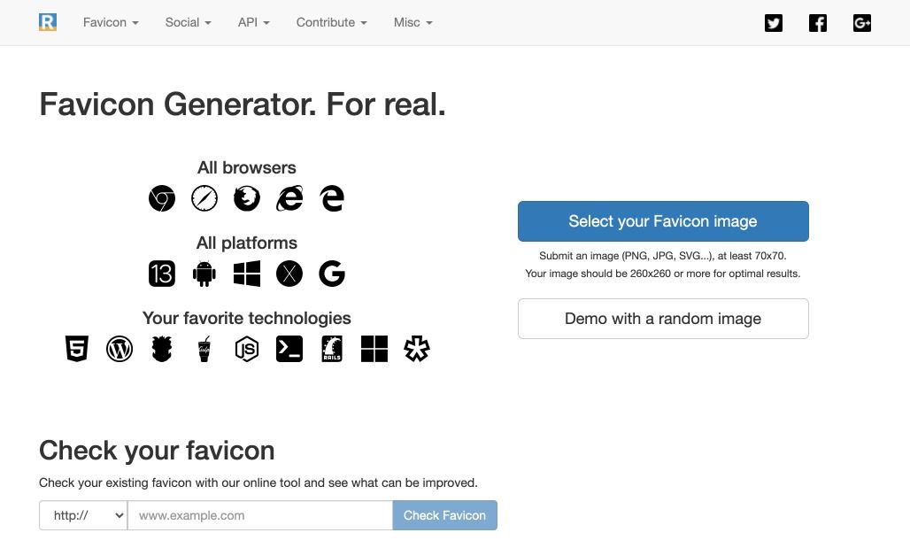次に、各種サイズを1つ1つ作成するのは大変なので、自動生成してくれるサイトでアイコンに関するファイルを一括生成します。 いくつかありますが、今回は以下を使用します。 Favicon Generator for perfect icons on all browsers