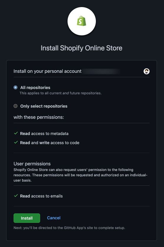 すると、「Shopify Online Store」のGitHubアプリのインストール画面が開くため、接続するリポジトリを選択(全ての場合は「All repositories」)して、「Install」ボタンを押します。