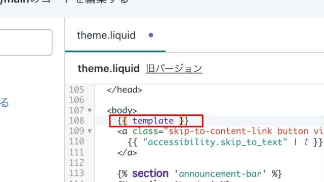 次にコードエディター(オンラインストア→アクション→コードを編集する)から、試しにtheme.liquid のbody直下に {{ template }} を追加してみます。