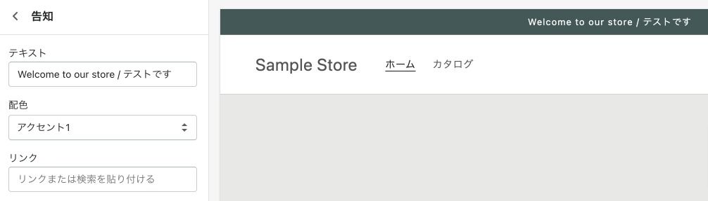 Shopify管理画面のテーマエディター(オンラインストア→カスタマイズ)から、試しに「告知バー」のテキストを変えてみます。