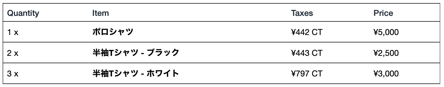 デフォルトでは「数量・商品名・税金・小計」となっていますが、