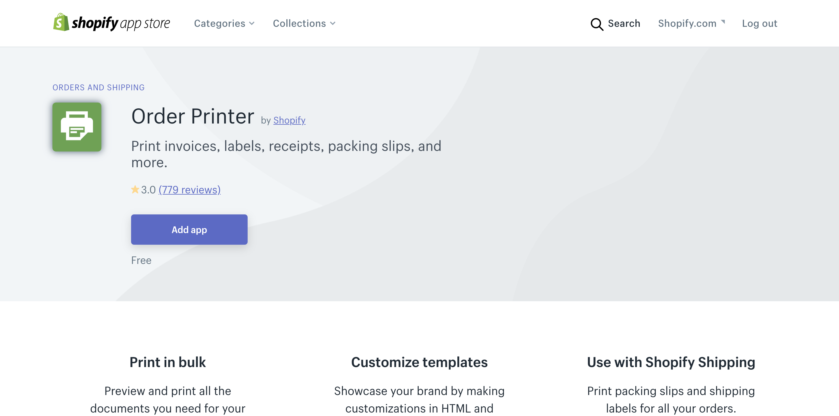 まず、管理画面のアプリ管理から、「Shopifyアプリストアに行く」ボタンを押し、アプリストアで「Order Printer」と検索しアプリページに遷移します。 →直接アクセスはこちら