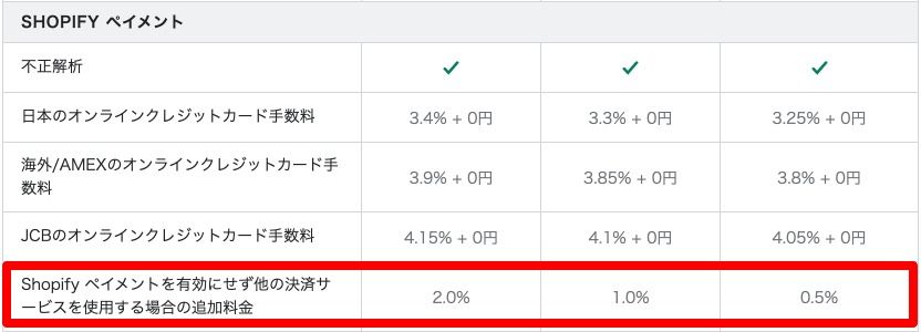 「Shopifyペイメントを有効にせず他の決済サービスを使用する場合の追加料金」がかかります。