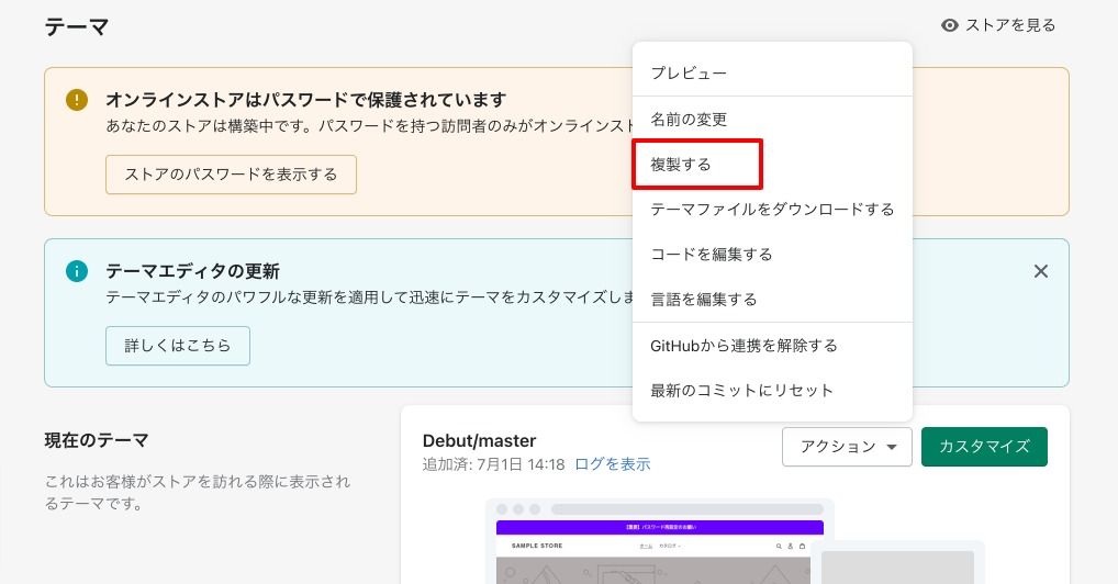 次に念のためテーマをバックアップしておきます。 管理画面の「オンラインストア」→「アクション」から、「複製する」を押してしばらく待てばOK。