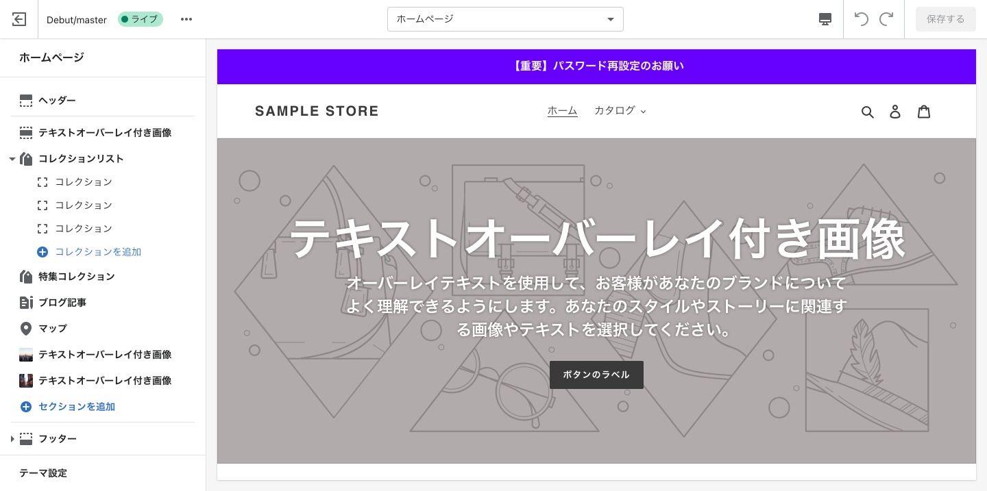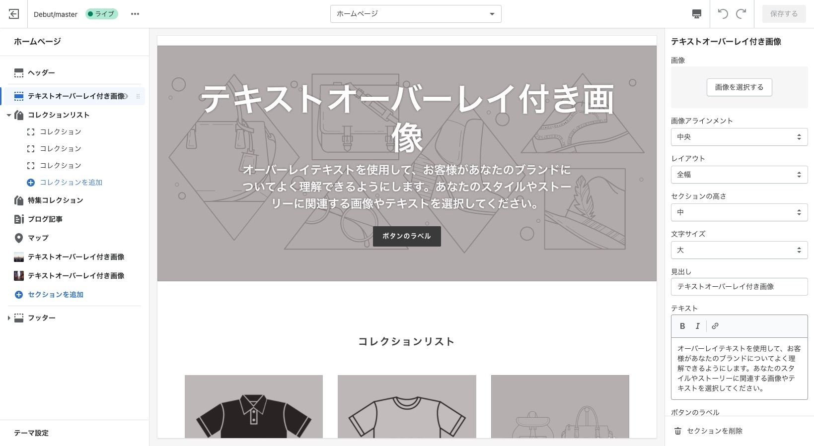 これでコレクションページもセクションを自由に追加できるようになりました。